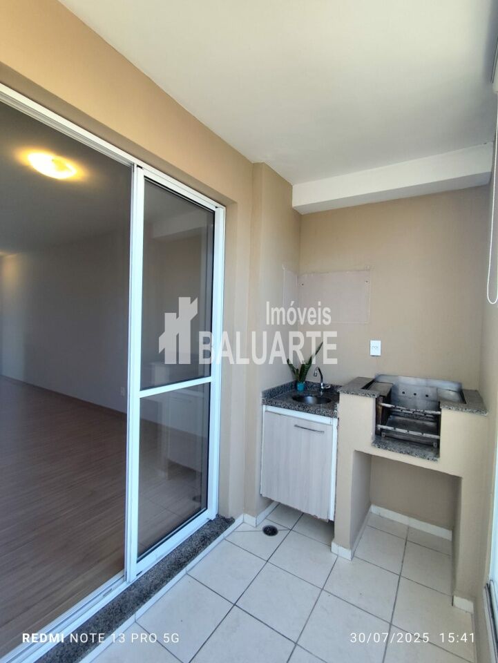Sala com terraço, com churrasqueira e fechamento em vidro.