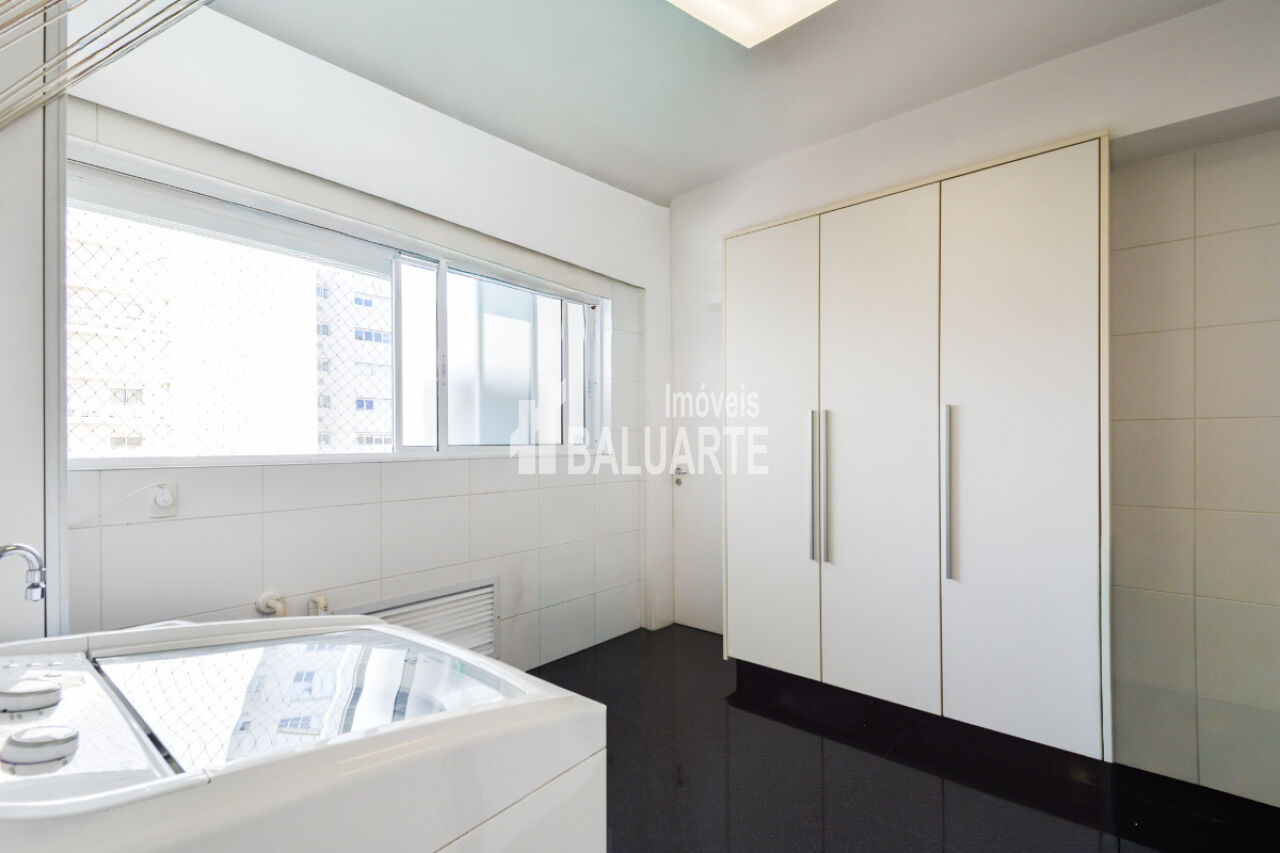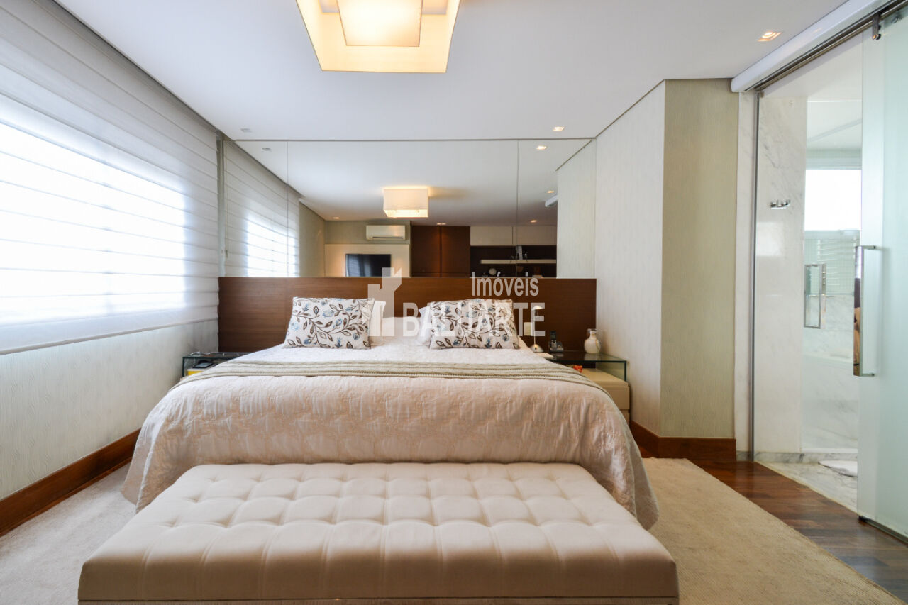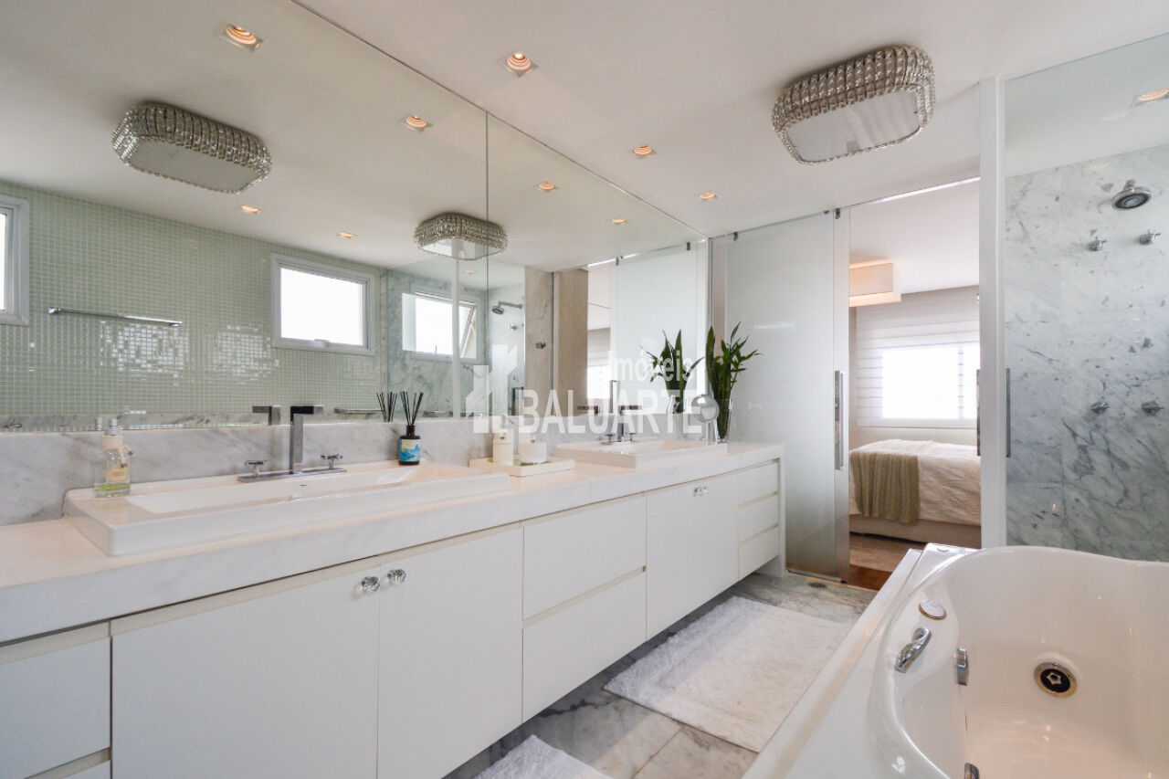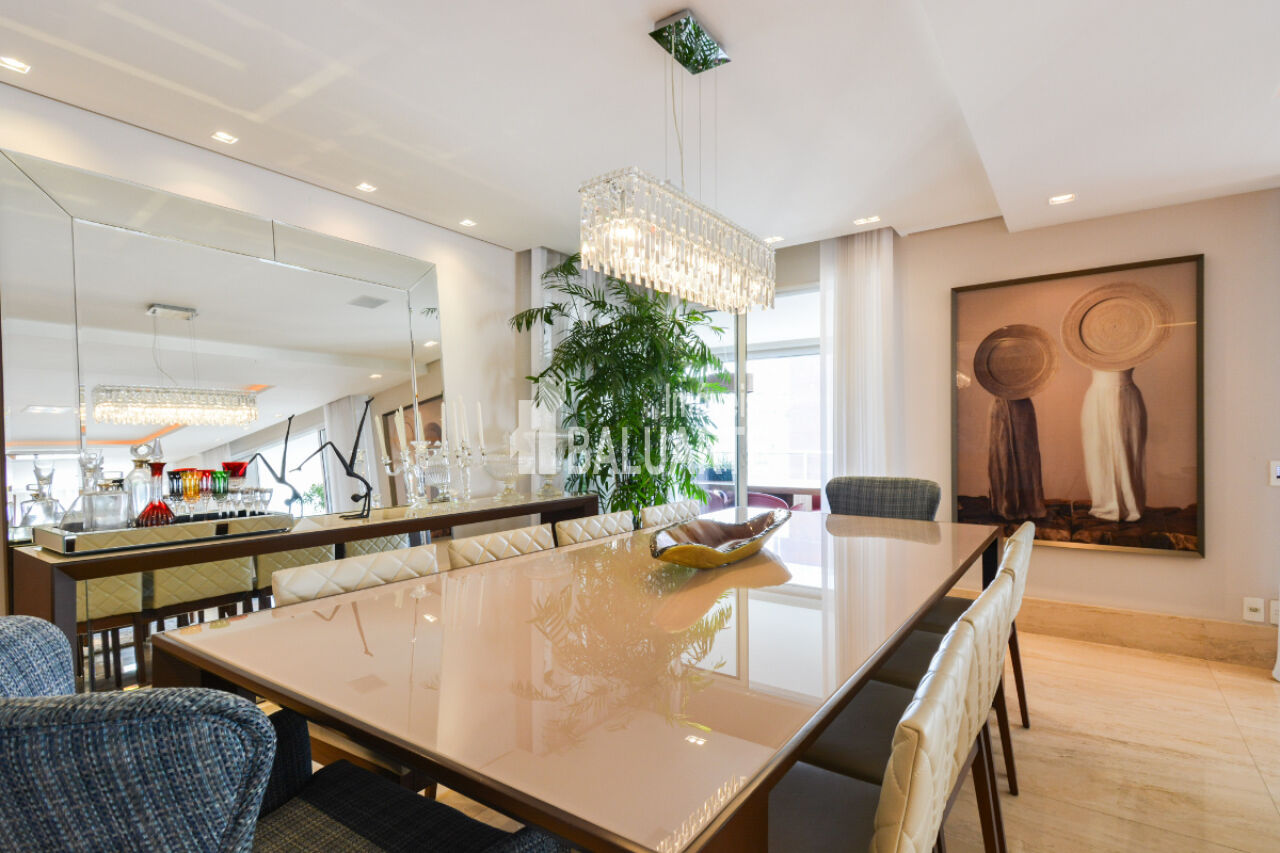 Com um andar alto, o apartamento proporciona uma vista deslumbrante da cidade, e a presença de janelas do tipo teto a chão amplia a sensação de espaço e iluminação natural. O imóvel também possui adega climatizada, área de serviço, dependência de funcionário e depósito.