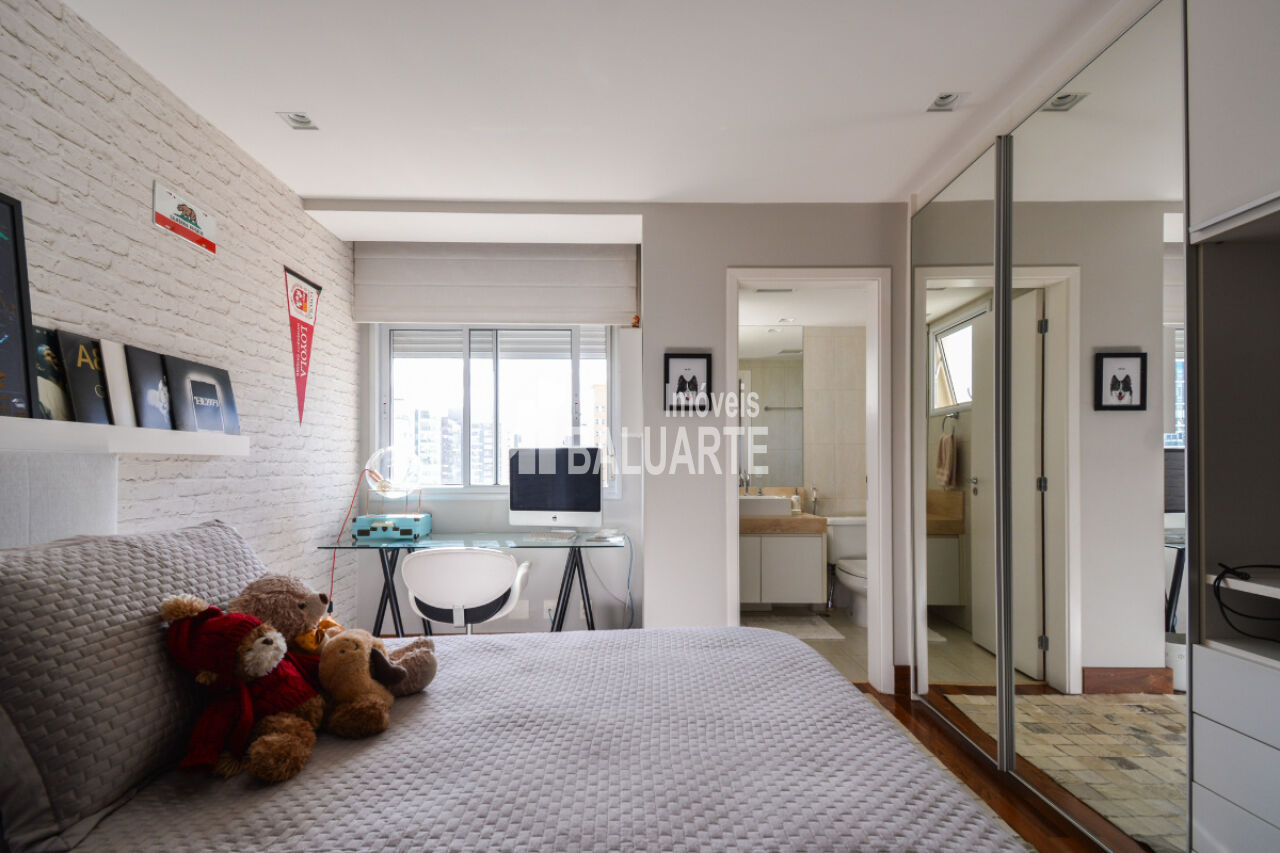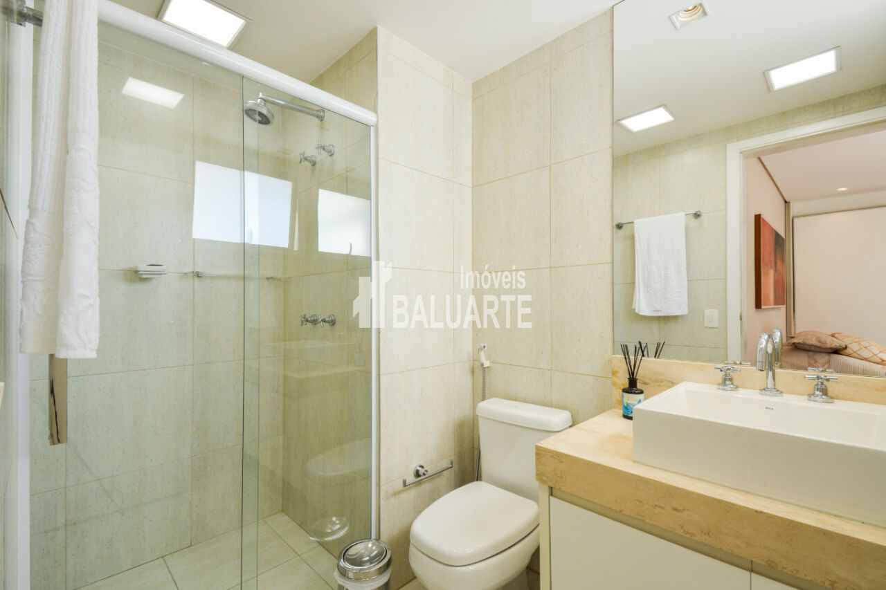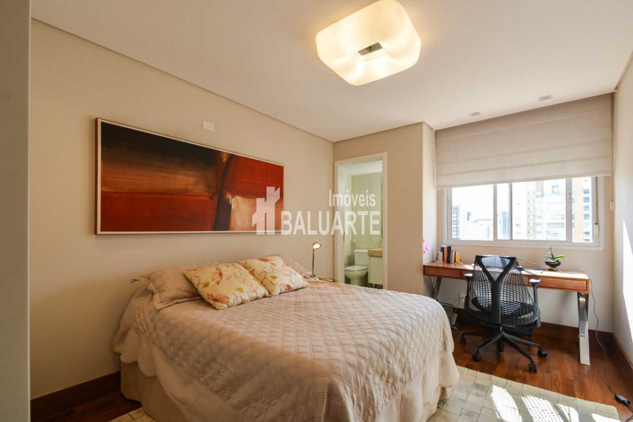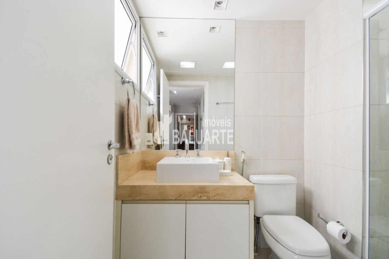 Com um andar alto, o apartamento proporciona uma vista deslumbrante da cidade, e a presença de janelas do tipo teto a chão amplia a sensação de espaço e iluminação natural. O imóvel também possui adega climatizada, área de serviço, dependência de funcionário e depósito.