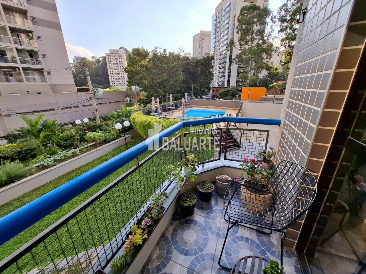 Salão de festas, piscina e jardim.