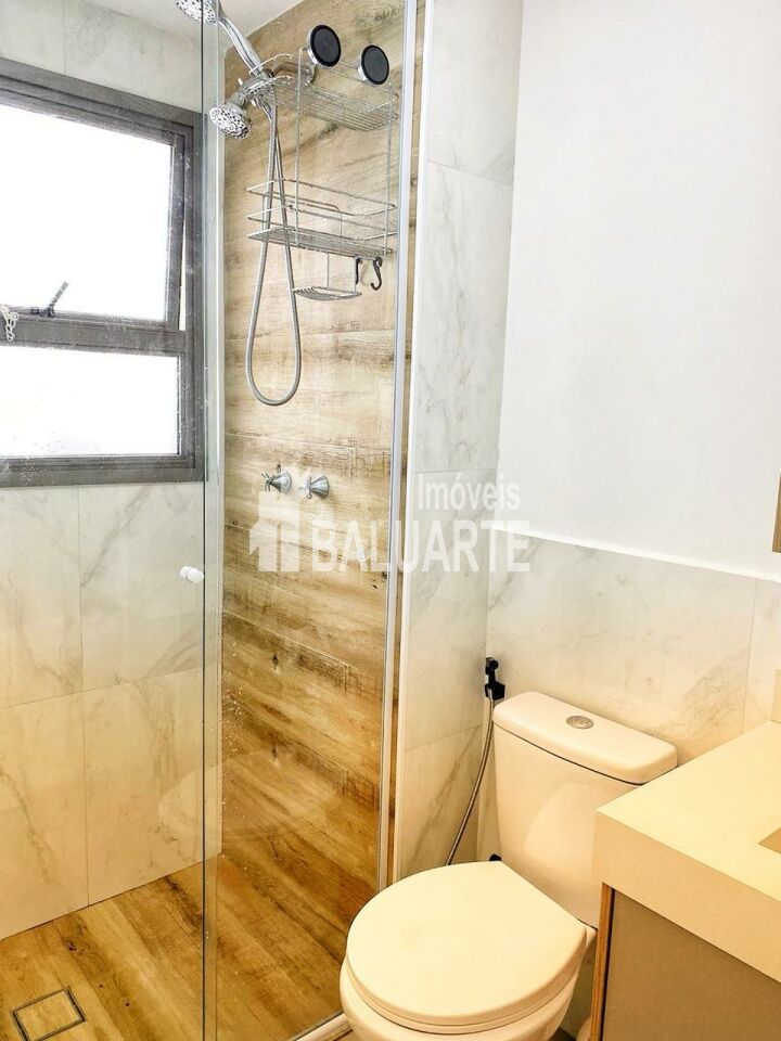 Piso vinílico nas áreas intimas e porcelanato na cozinha e banheiros.