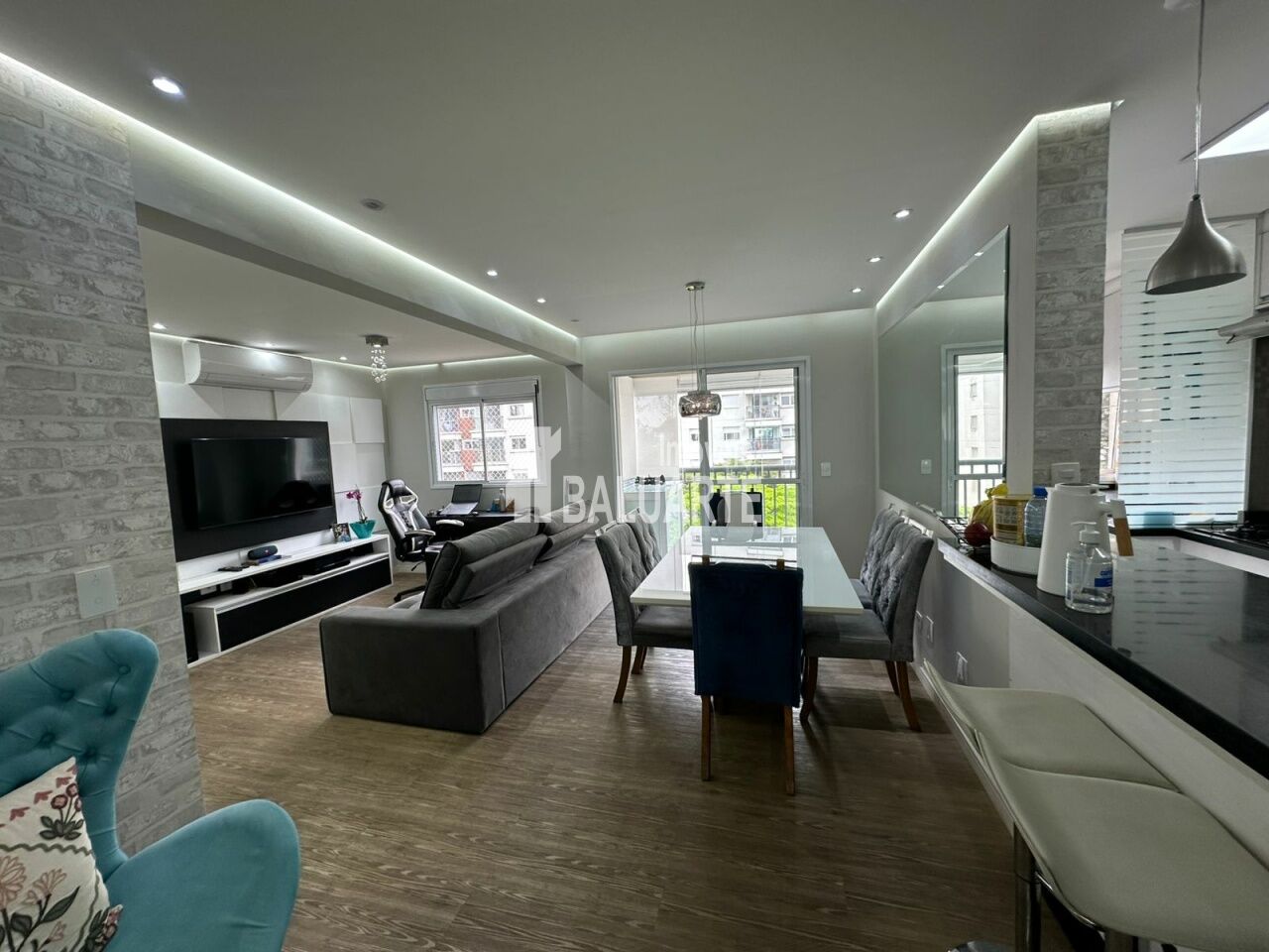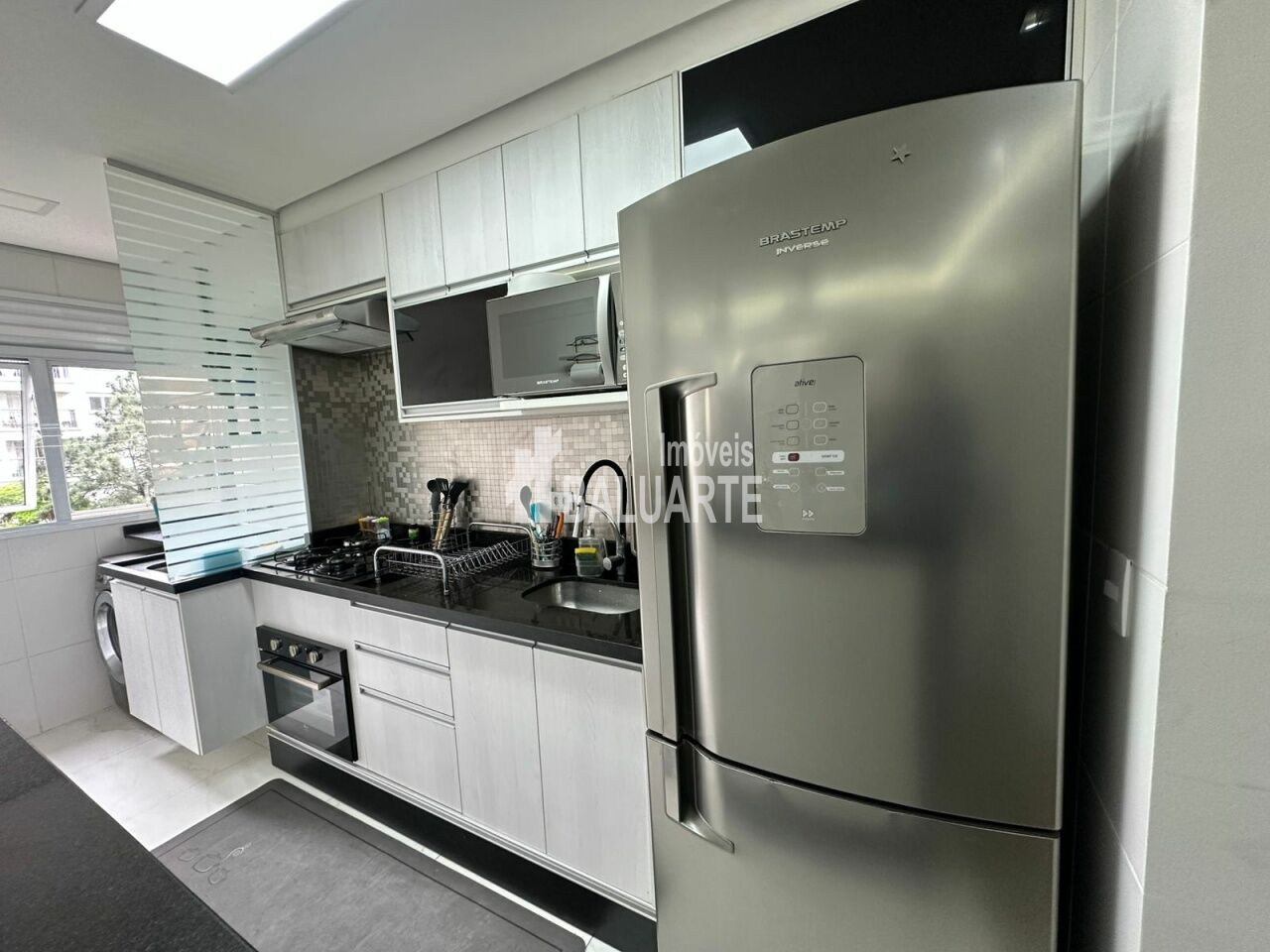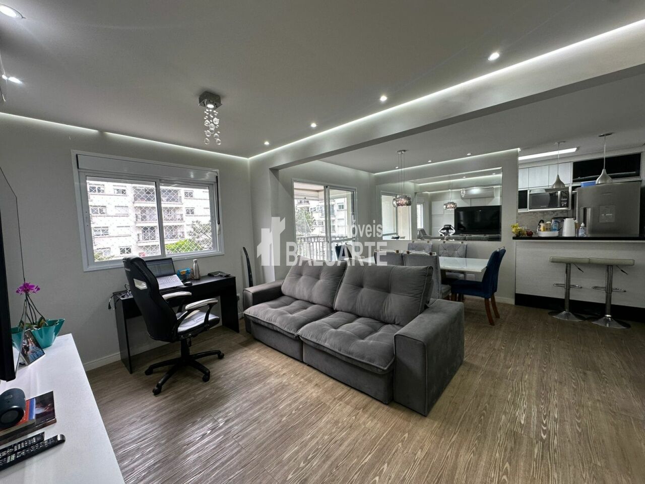 Ao entrar você é recebido por uma sala linda com móveis planejados, piso de porcelanato, bem iluminada, com dois ambientes (estar e jantar), para reunir amigos e familiares. Cozinha conceito aberto, moderna, com armários planejados, bancada de granito, equipada com forno, cooktop e exaustor, que permitem integração enquanto prepara suas refeições.