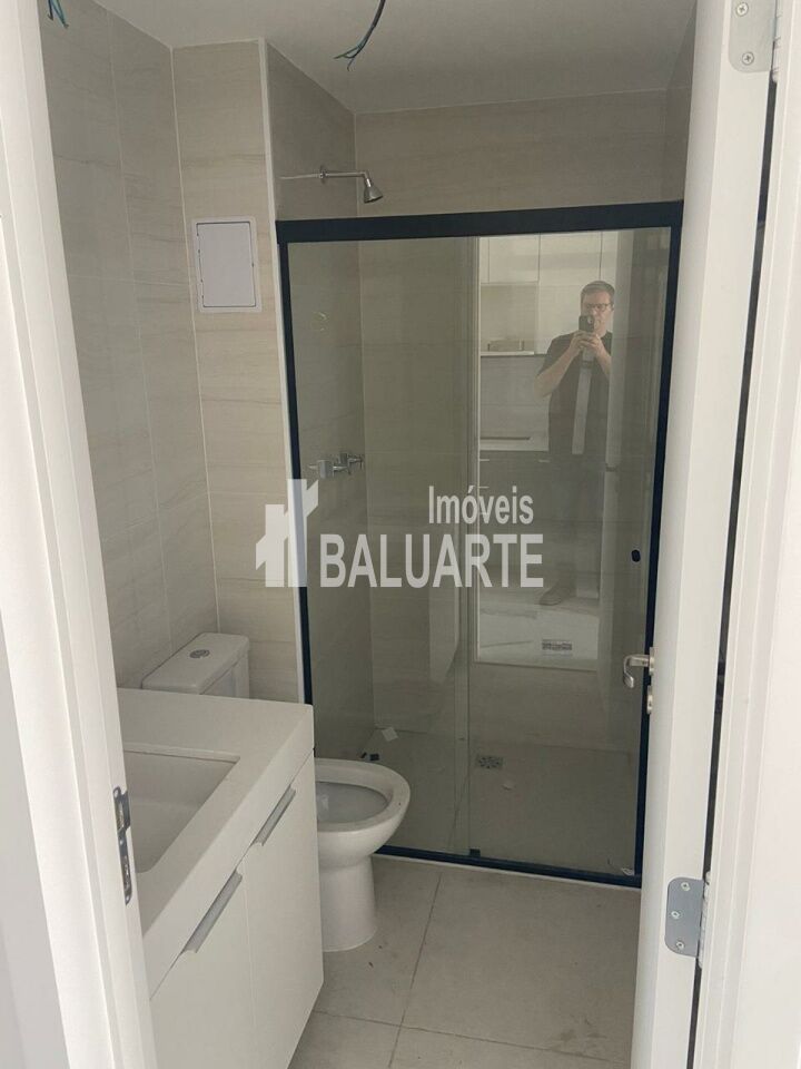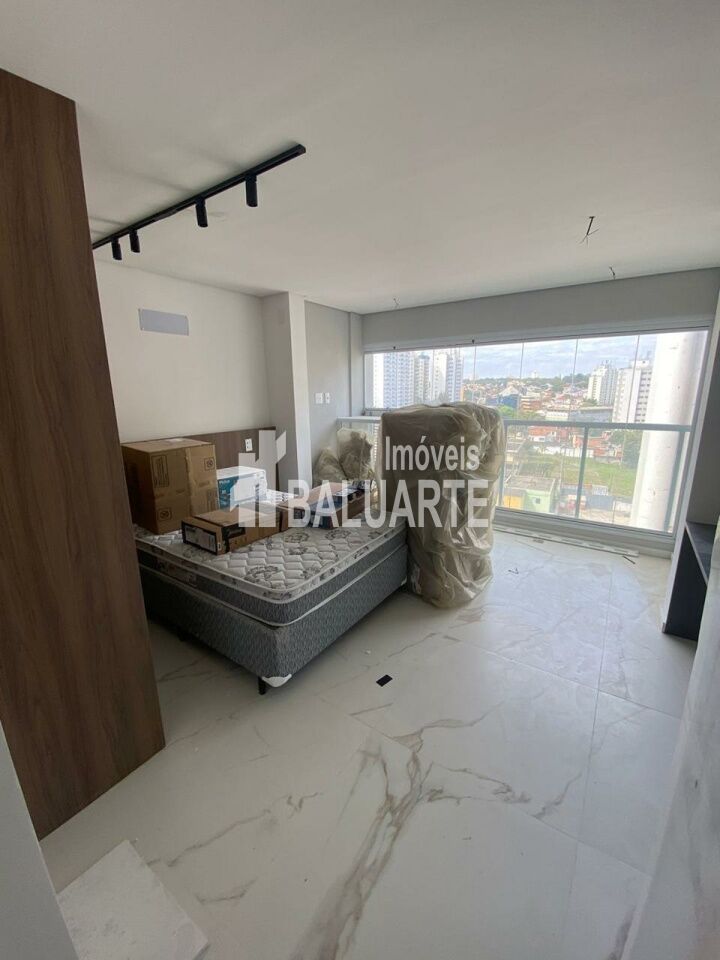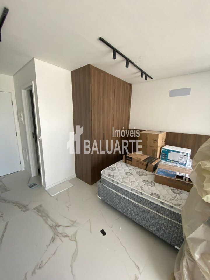 Studio com 25 m2, mobiliado com cama, armários, geladeira, cooktop, mirooondas, televisão, sofá, cadeiras, box no banheiro e etc.