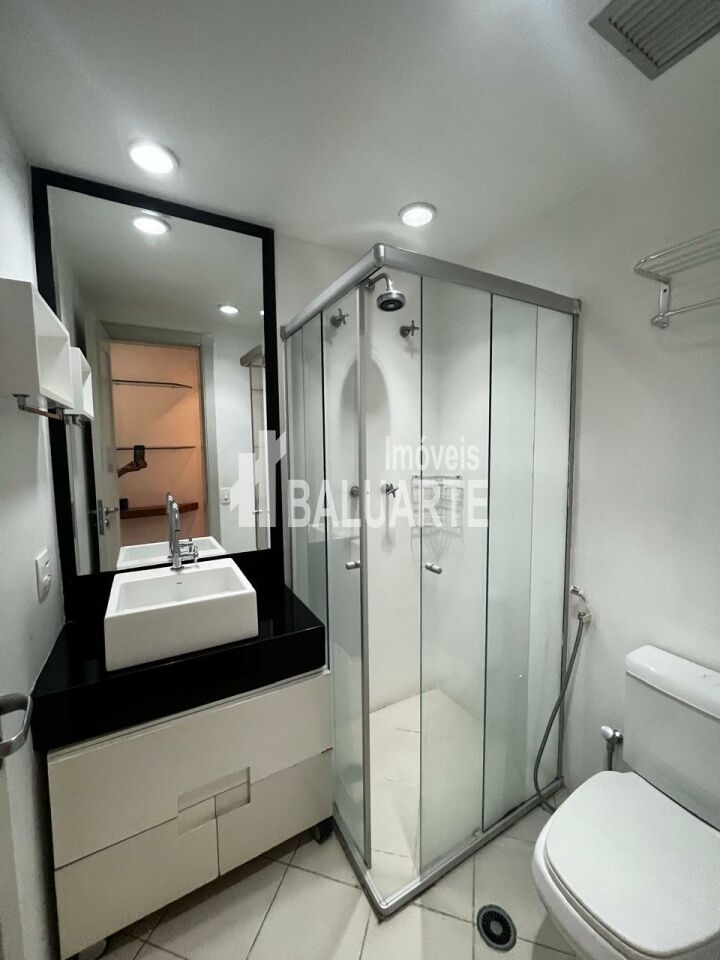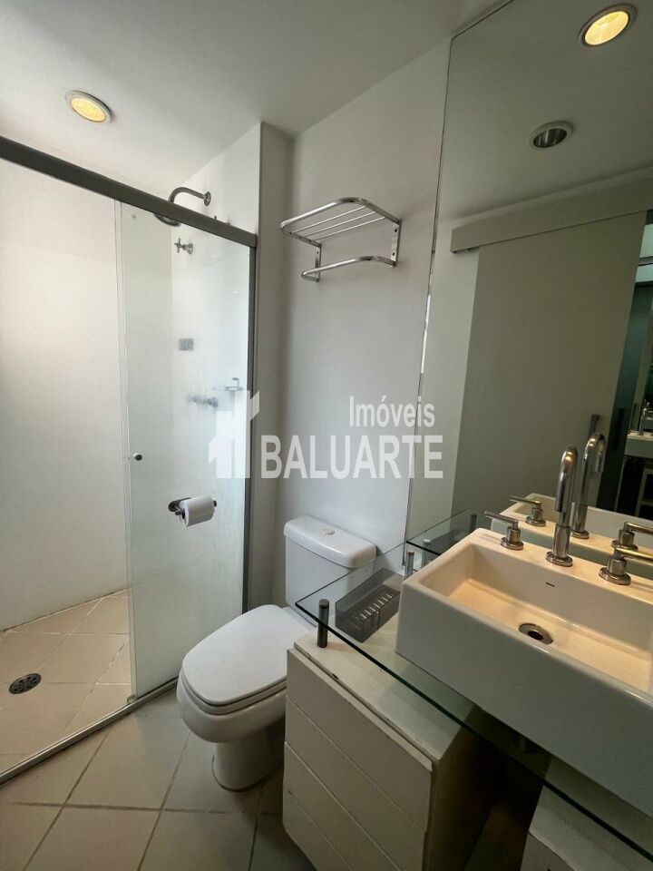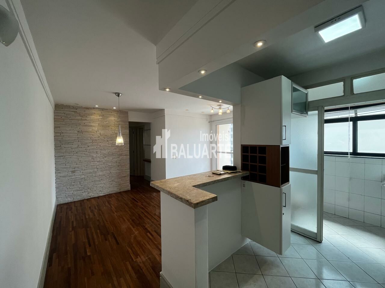 Apartamento na Vila Olimpia, 60 m² com sala p 2 ambientes, piso de madeira e revestimento no ambiente da mesa de jantar, projeto de iluminação, ar condicionado nos 2 dormitórios e uma ampla área de serviços com ventilação natural.