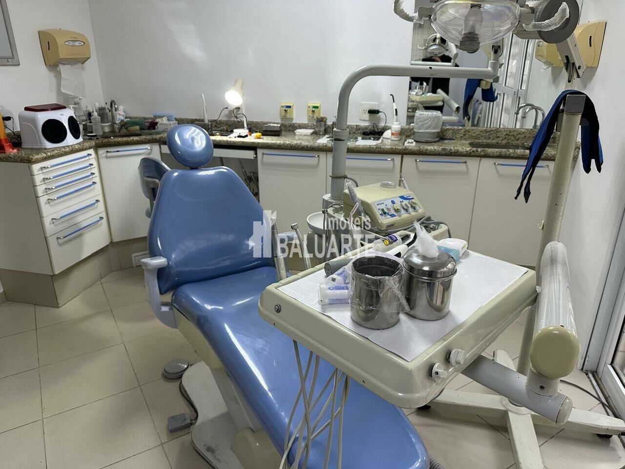 ? Móvel atrás do paciente com seringa Tríplice e micro motor com peça reta para ajuste de trabalhos protéticos,para não ter risco voar fragmentos no paciente.