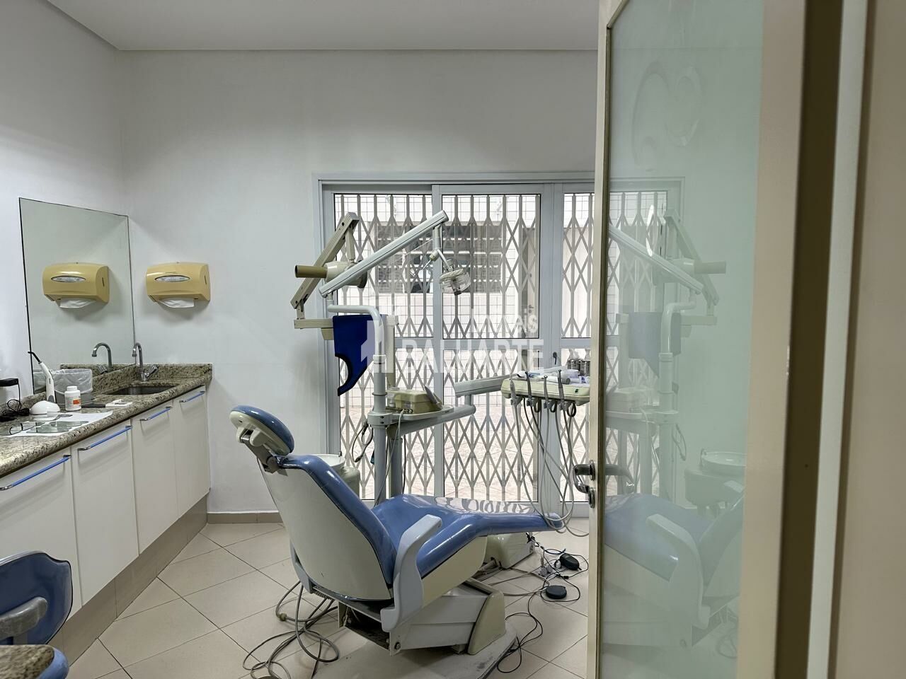 ? Porta de vidro ampla ,que oferece iluminação natural, que ajuda na escolha da cor dos dentes de serviços protéticos.
